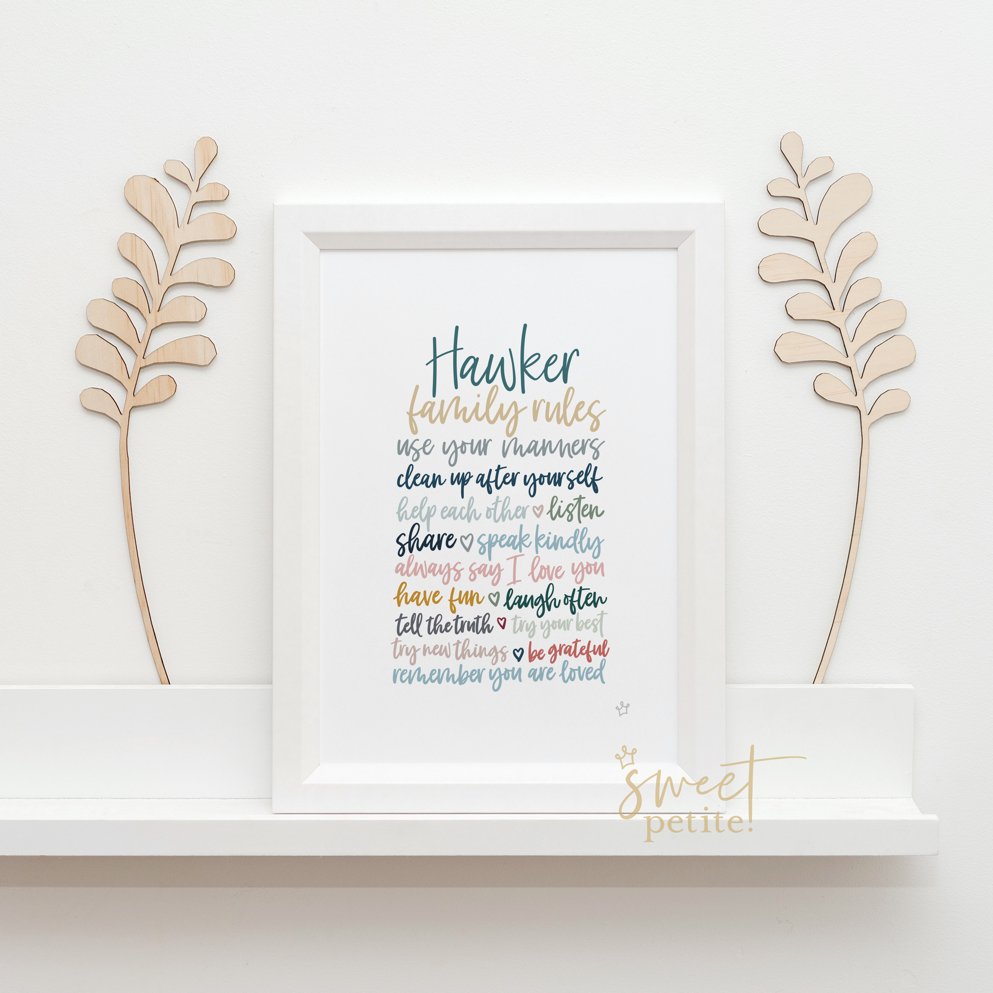 Our Family Rules print is a statement piece that gives beautiful cues for your children about the rules in your home. The sayings within this print can be gentle prompts to teach them about treating others with kindness, love and care. The nurturing statements have been chosen carefully and are great ways to remind them how valuable they are within your family and the importance of giving everything a go.