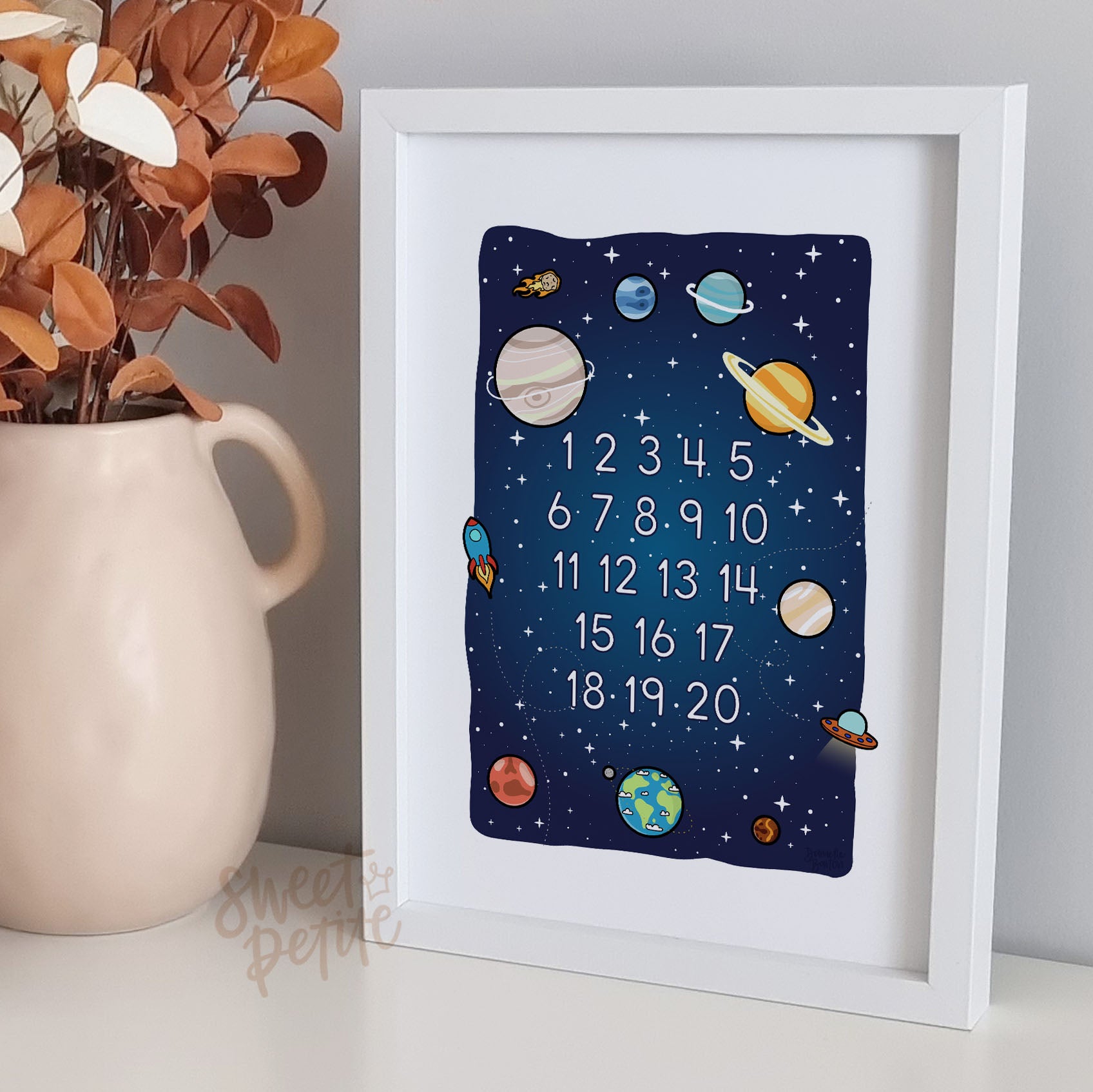 This galaxy numbers print is perfect for lovers of stargazing, the night sky or even the solar system. The numbers 1-20 are surrounded by planets, stars, a rocket, a sly UFO and even a comet! Each of the planets from our solar system are represented. The numbers are intentionally shown in a rounded sans serif font that's easy for young readers to identify the individual numbers.