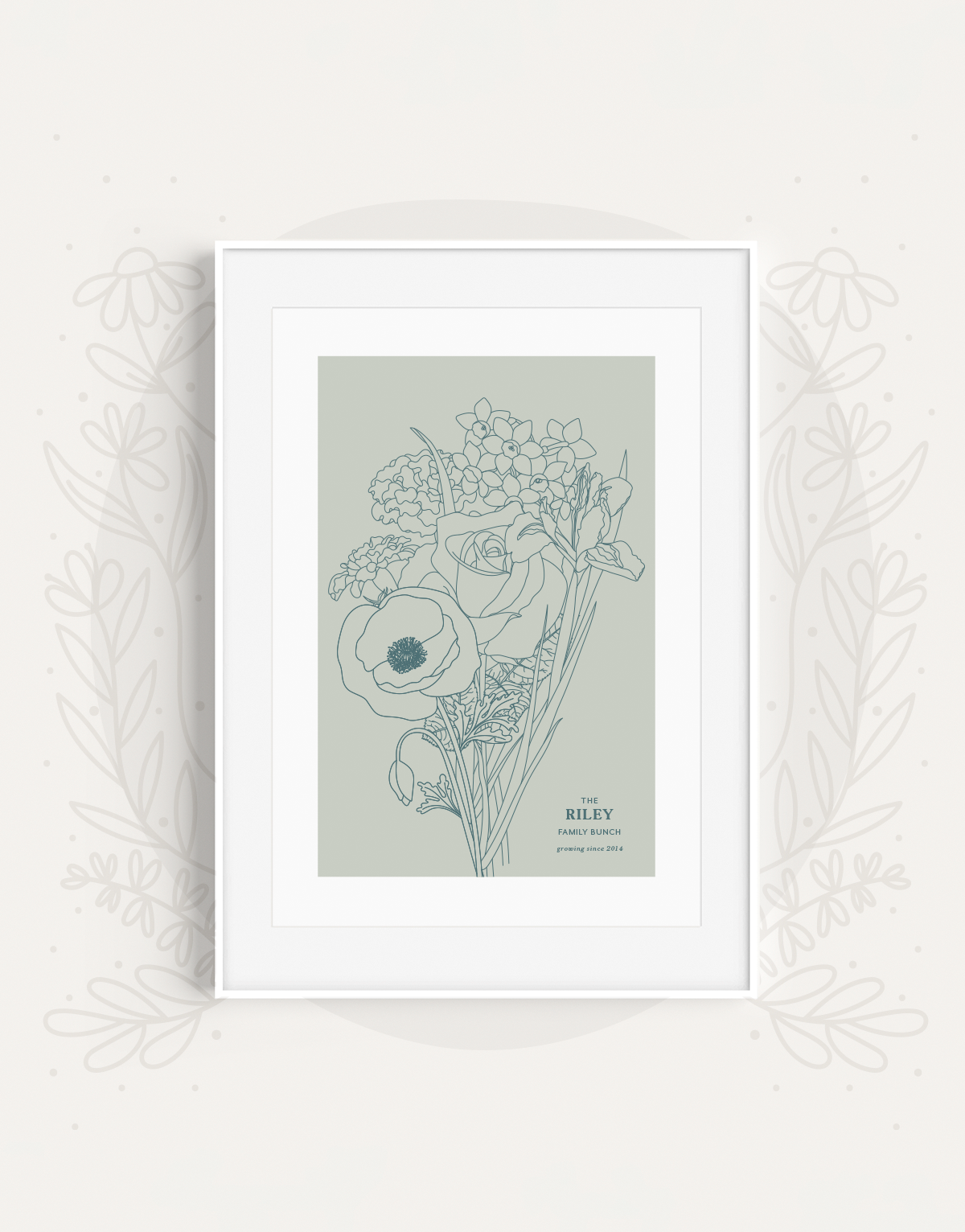 No two prints will be alike, they'll be as unique as your family in terms of the flowers used. Below the floral arrangement are words displaying your family name (example: The Newport Family Bunch and an option to have the line below showing 'growing since 1964.' If you don't want a date included, leave this space blank.