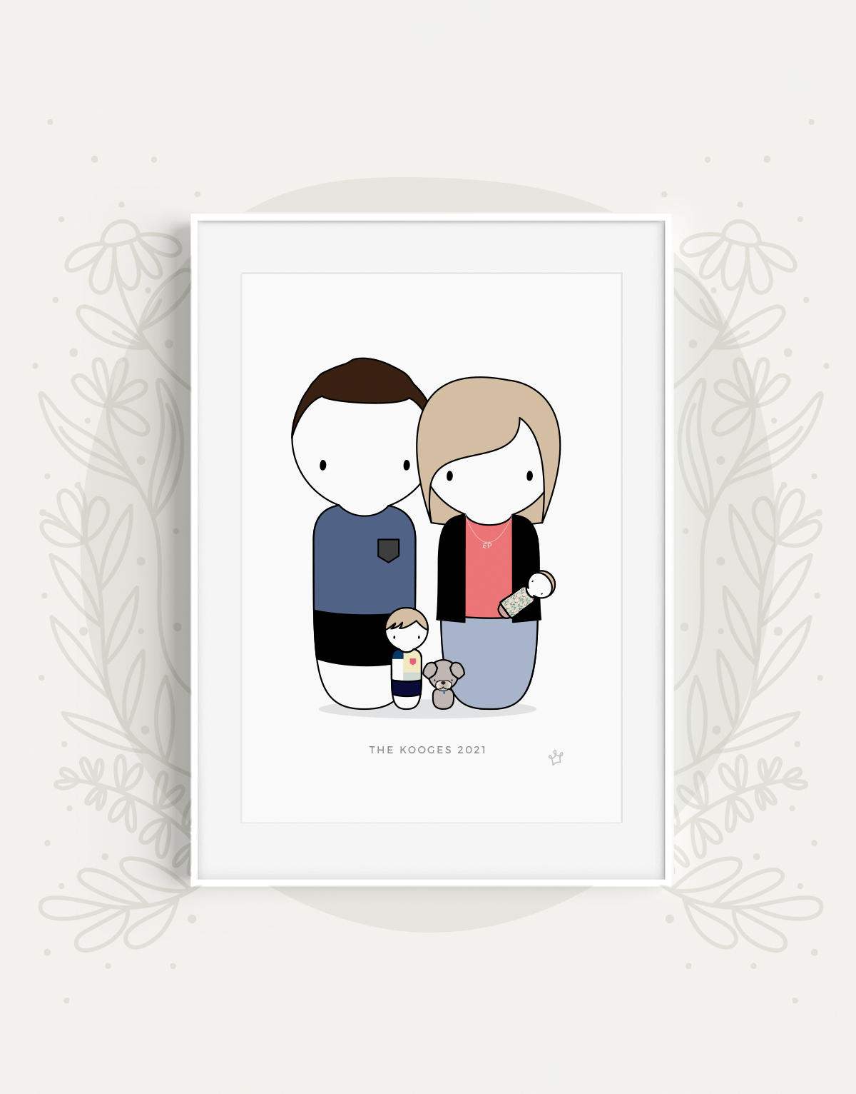 A personalised Peg Family Portrait perfectly represents those you love - both near and far. With each family member individually designed to match their unique style, you're capturing a beautiful moment in time. The kids are clean; nobody is grumpy that they're cold out at the park, and the best bit is that you haven't even had to leave the house! I love to include pets of all kinds - they're family too! One of the great bonuses to having a family portrait created like this is that you don't all have to be in the same place together!