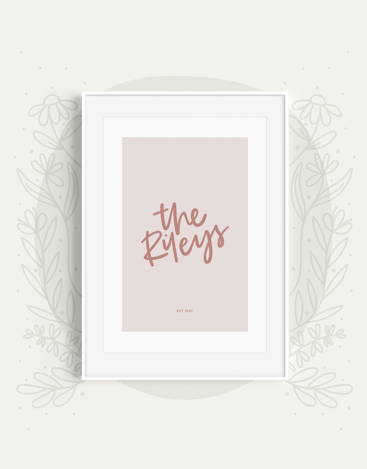 This particular design includes your family name which will be digitally lettered by me in my signature, calligraphic style. Underneath that your established date is displayed in a minimal sans serif font.