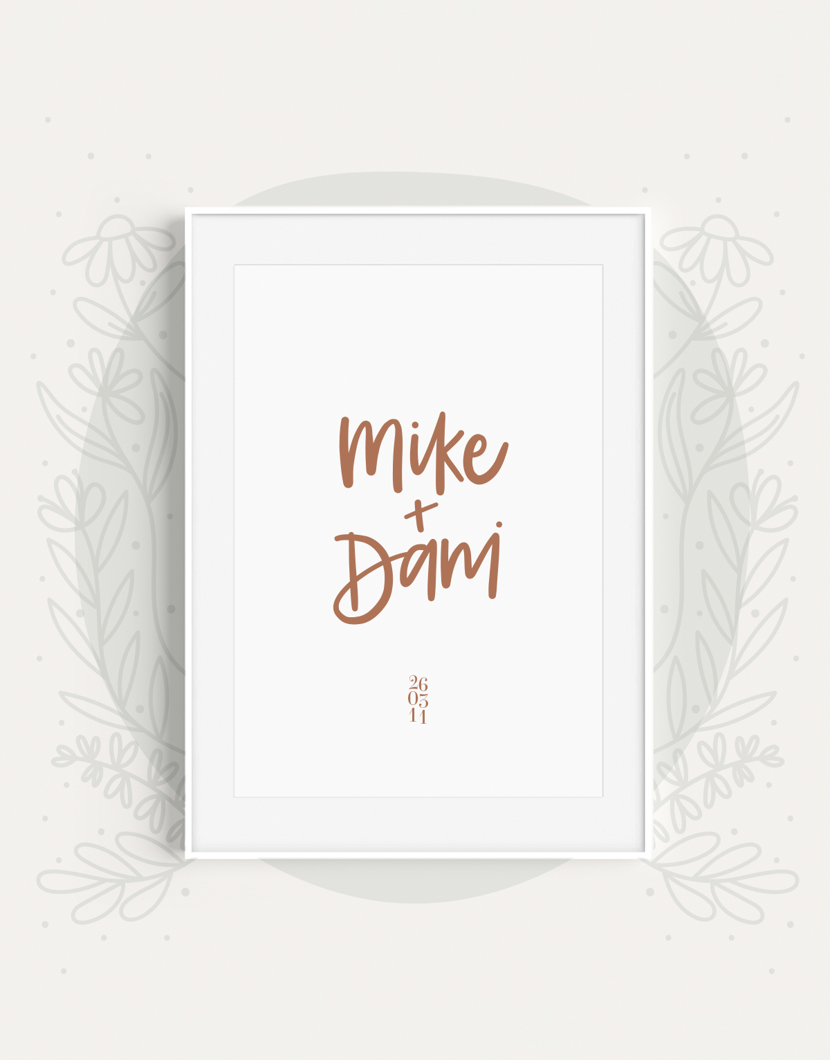 Both names of the couple will be digitally lettered by me in my signature, calligraphic style. Underneath that the special date is displayed in a beautiful wedding inspired serif font.